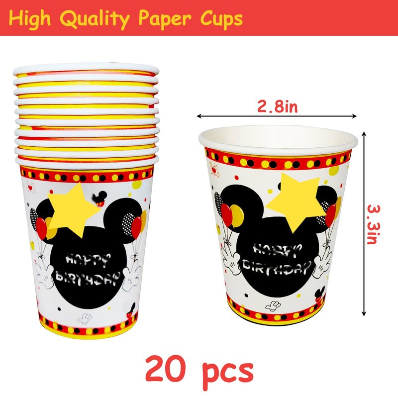 - Kit for 20 guests: 117 pieces of cartoon theme party tableware kit, including 9" 20pcs dessert plates, 7" 20pcs dessert plates, 6.5" 20pcs napkins, 20pcs plastic forks, 20pcs paper cups, 2pcs table cloths, and 15pcs "happy birthday" banner for 20 guests