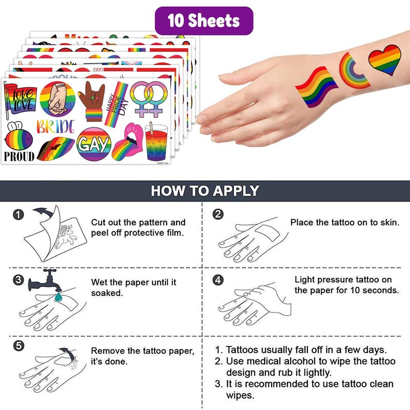 - π PERFECT TATTOOS FOR LGBT THEMED DECORATION: LGBT TATTOOS for people who love LGBT, show your pride attitude and support LGBTQ activities and undertakings. Featuring 10 sheets with 118 pcs of lovely, fun and colorful design. Each sheet measures 6.1 * 3.1 inches. You can temporarily tattoo them on your body or objects such as phones, bottles, laptopβ¦