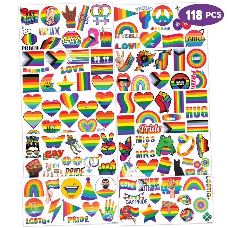 118 PCS LGBT Rainbow Flag Pride Temporary Tattoos Sticker Pride Month Gay Birthday Party Decorations Favors Supplies Gifts Boys Girls Men Woman Cute Fake Tattoo School Reward Themed Festival