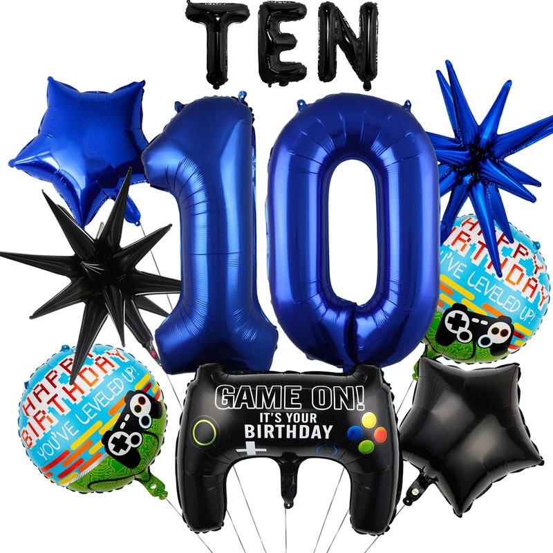 11pcs Video Game Themed Party Decorations, Number 10th Boys Birthday Party Supplies, Navy Blue Video Game Controller Mylar Foil Balloon, Video Game Party Decoration Supplies