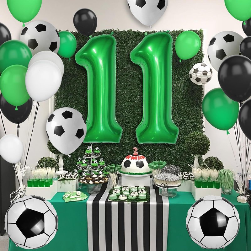 - 11TH BIRTHDAY SOCCER DECORATIONS:You will receive dark green balloons(25pcs),black balloons(25pcs),light green balloons(15pcs),white balloons(5pcs),latex soccer (8pcs),long white balloons(2pcs),18inch aluminum foil soccer balloons(2pcs),32inch number11 foil balloon(1pcs),green happy birthday banner(1pcs),a ribbon, balloon chain stickers,great for soccer 11th birthday party decorations