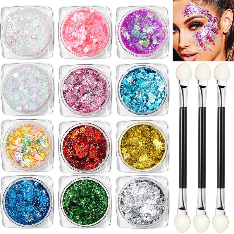 12 Colors Body Glitter Gel Kit, Super Long Lasting Holographic Chunky Glitter Gel Festival Party Makeup for Face, Body, Hair, Nail Art, Eyeshadow, 3Pcs Sponge Makeup Brush Include (Set A)