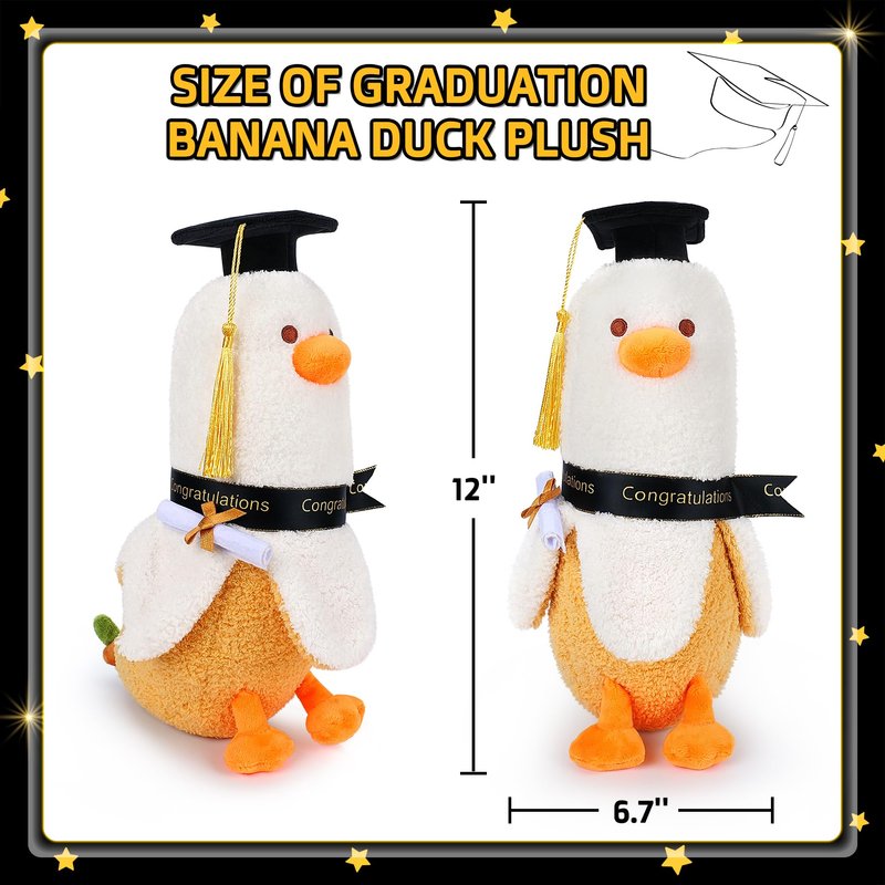 - 👩🎓 【Cute Graduation Banana Duck Plush Toy】This Graduation duck plush is approx 12inch size long.The banana duck plush is made of ultra-soft and cuddly fur material that you fall in love with it. It comes with a black cap and diploma. Give a unique gift to your loved one on his or her Graduation day. Our cute Banana Duck plushies are in banana and duck shape with embroidery craftsmanship, very fun and cute. You can use this duck banana stuffed animal pillow as your or your child's sleeping companion!