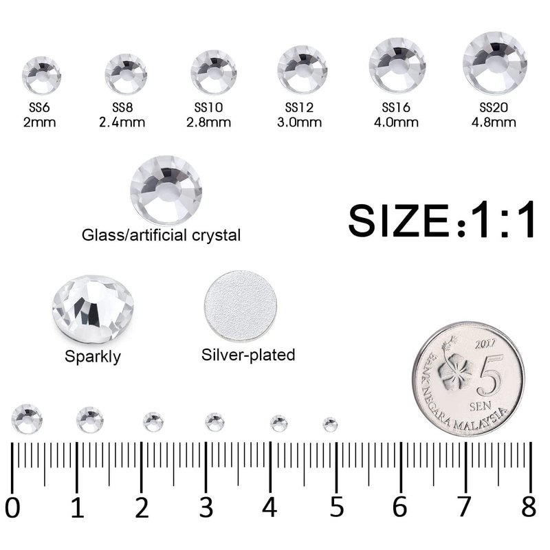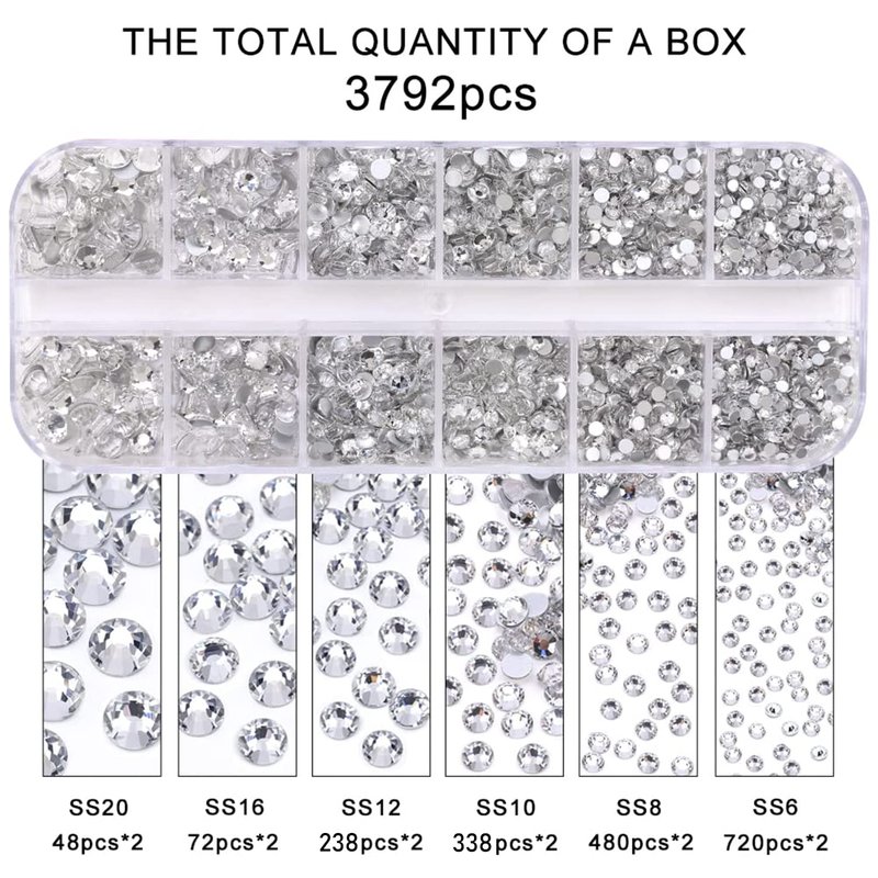 Nail rhinestones for acrylic nails set includes: SS6 2MM - 1440pcs, SS8 2.4MM - 960pcs, SS10 2.8MM - 676pcs, SS12 3MM - 476pcs, SS16 4MM - 144pcs, SS20 4.8MM - 96pcs. Total is 3792pcs.