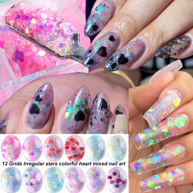- Holographic Sequins:Number: 12 grids, color: color, a variety of irregular mix sizes shapes of heart, stars, hexagons and other patterns, rich patterns and bright colors to bring you the same passion of summer. The sequins under the sun, is color, can be stitched out more creative patterns, all-around characteristics, refraction out of the most dazzling light!