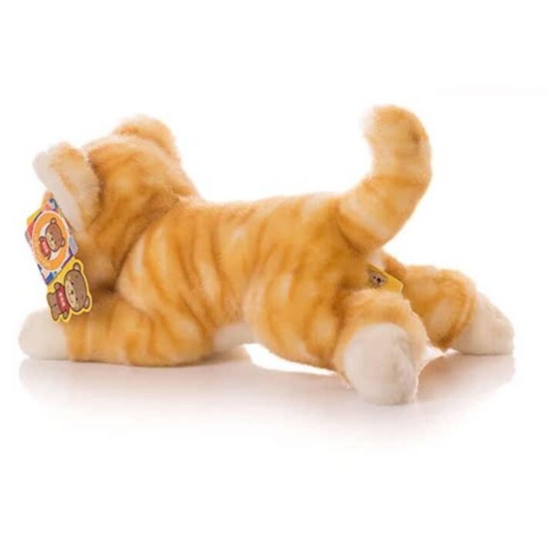 Simulated plush, with surface fuzz made of acrylic fiber material and a fluffy and soft feel. Acrylic fiber known as artificial wool, has the characteristics of softness, fluffinessl. The filling material is PP cotton, which is clean, white, soft, and elastic. It is not afraid of water washing and does not deform. The Cat total length is 12 inches, which is very suitable for children to grasp and easy to carry. Simulated design, giving the impression that it is a living animal.