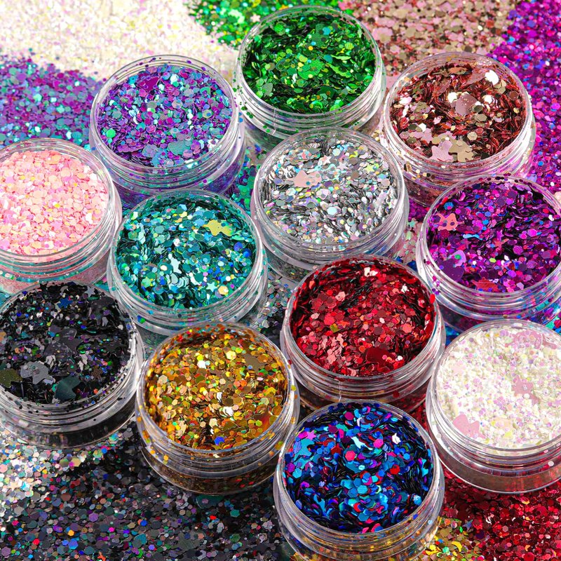 - ✮ GREAT AMOUNT+FREE QUICK DRY GLUE: You will receive 12 pots of cosmetic glitter with 8g/0.28oz, quite enough for mutiple times deco, also, free 5ml quick dry glitter glue gel*2 is included.