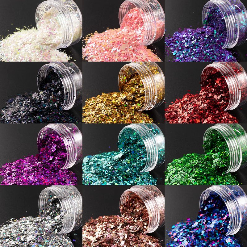 - ✮12 COLORS OF COSMETIC HOLO CHUNKY GLITTER: Silver, Gold, Purplish Red, Purplish Blue, Magic Purple, Black, Pink, Light Pink&White, Red, Green, Turquoise, Rose Gold.