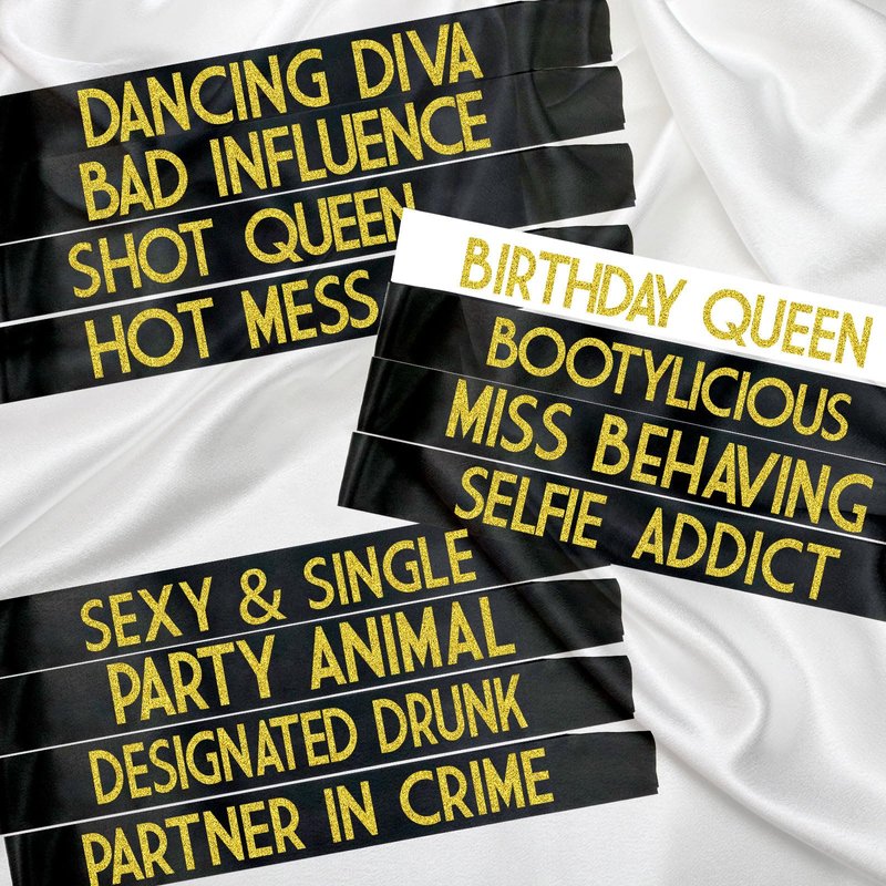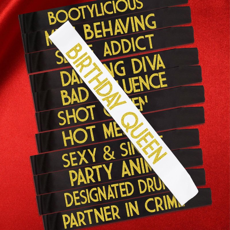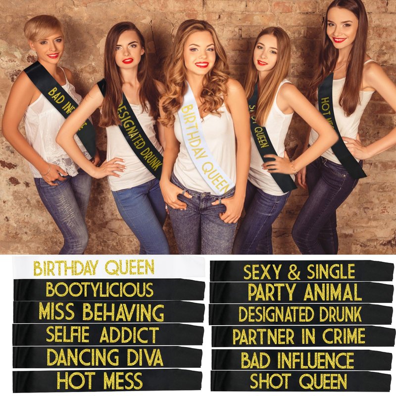 - 🎂【FUNNY SASHES FOR BIRTHDAY PARTY】12 Funny Glitter Birthday Sashes: 1 "BIRTHDAY QUEEN" 2 "SEXY & SINGLE" 3 "DANCING DIVA" 4 "MISS BEHAVING" 5 "DESIGNATED DRUNK" 6 "BOOTYLICIOUS 7 "SELFIE ADDICT" 8 "BAD INFLUENCE" 9 "HOT MESS" 10 "SHOT QUEEN" 11 "PARTNER IN CRIME" 12 "PARTY ANIMAL". Enjoy a memorable birthday with this sashes. You can upgrade your Sweet 16 Party, 18th Birthday Party, 21st Celebration, Dirty 30 or any other birthday parties.