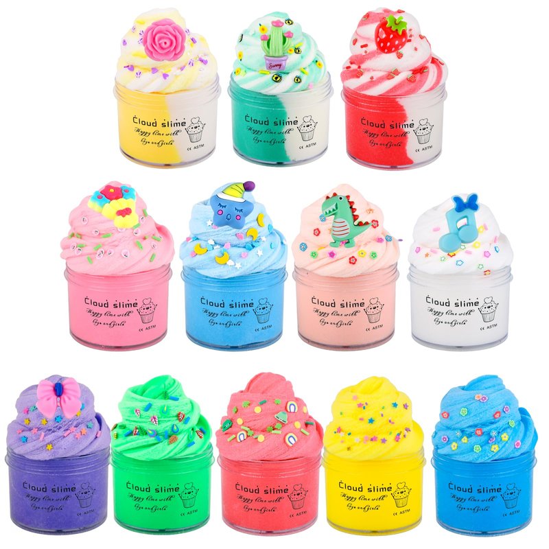 - 12 pack mini cloud slimes come with cute charms and slices, within good cloud slime scents. Easy to clean and safe candy sludge toy for boys and girls. ASTM certified, recommend for age 5+, smaller kids use under adult supervision