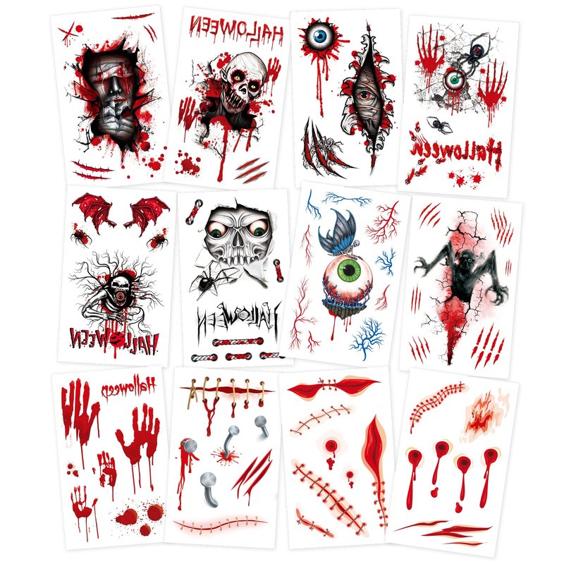 - HALLOWEEN-THEMED DESIGNS::-- This 12-pack set features a variety of Halloween temporary tattoos including skulls, scars, ghosts, spiders, eyeballs, bloodstains, and nails. Perfect for creating a spooky look for Halloween parties and events.