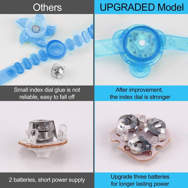 - Holloween Gifts for kids: 12 Pack light up bracelet toys, Sparkling LED can light up the night around you at party. It comes in 5 colors and will have 3 random styles. This a combination of bracelet, led and Spinner toy.