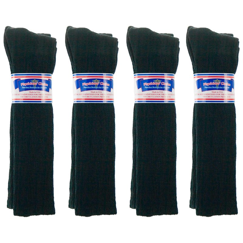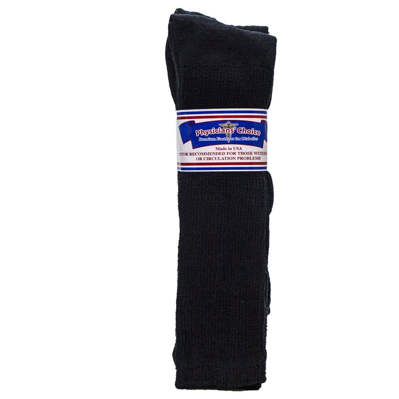 Product description: Physicians Choice Black Over The Calf Diabetic Socks. Size 13-15. Made In The USA. 80% Cotton 15% Nylon 5% Spandex These Extra Long Version Of Our Popular Physicians Choice Crew Socks Feature A Loose Fit Non-Binding Top For Better Circulation, Cushioned Foot For Comfort, A Ultra Flat Toe Seam And Our Moisture Vent System. Doctor Approved For Those With Poor Circulation Or Diabetes. Top Has an 11" Cross Stretch To Stay Up Without Binding The Leg. 3 Pair To Band, 1 Dozen Pair (4 Packs Of 3 Pair) Per Bag. Why Do Diabetics Need Special Socks? A Diabetic Sock Is A Non-Binding And Non-Elasticated Sock Which Is Designed So As To Not Constrict The Foot Or Leg. Typically Sufferers Of Diabetes Are The Most Common Users Of This Type Of Sock. Diabetes Raises The Blood Sugar Level, Which Can Increase The Risk Of Foot Ulcers.