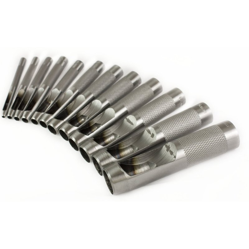 Sizes: 1/8", 5/32", 3/16", 7/32", 1/4", 5/16", 3/8", 7/16", 1/2", 9/16", 5/8", 3/4" Includes organizer pouch for easy storage High-carbon steel with heat-hardened edges for durable cutting power side slots to allow the slugs to fall out Perfect for any shop, home, garage