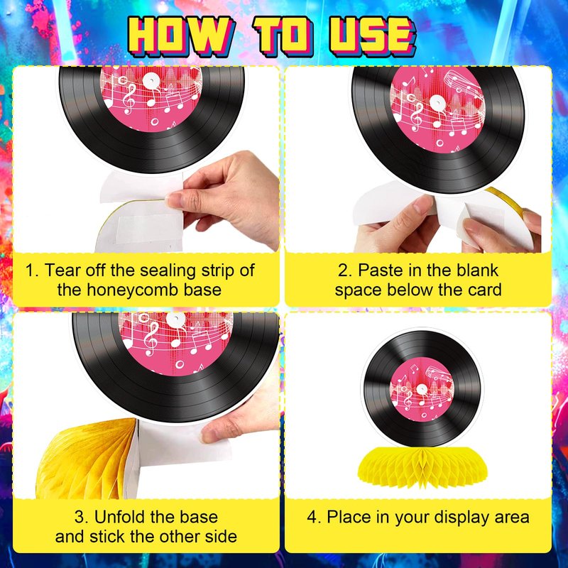 - 【Easy to assemble】: It only takes a few seconds to assemble the record tabletop decorations according to the picture, and then put them in the display area, saving your time and allowing you and your friends to enjoy the party; these record paper centerpieces will be ideal decorations for your music-themed party and leave good memories for your guests.