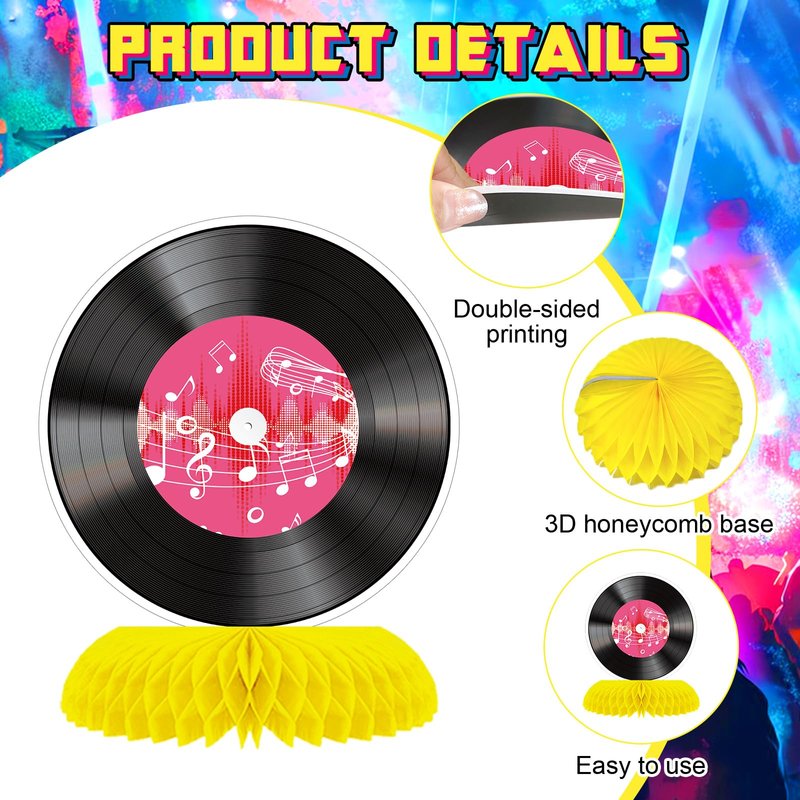 - 【High-quality materials】: Vinyl Record Honeycomb Centerpieces are made of thick and sturdy cardboard, double-sided printing, not easy to fade, deform or break, the honeycomb base is strong in stability, not easy to collapse, easy to store, and can be reused many times.