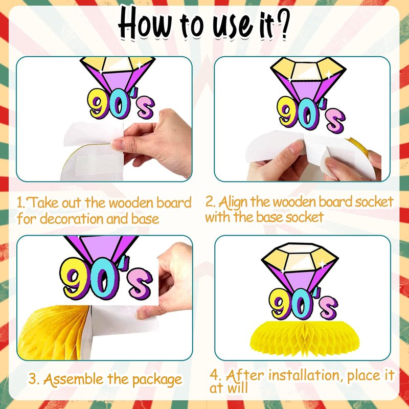 - 【Easy to install】: These 90s party supplies are very easy to assemble, just tear off the stickers on the honeycomb base and stick them on the card, then put it in your favorite display area, whether it is a tabletop or hanging effect is amazing.