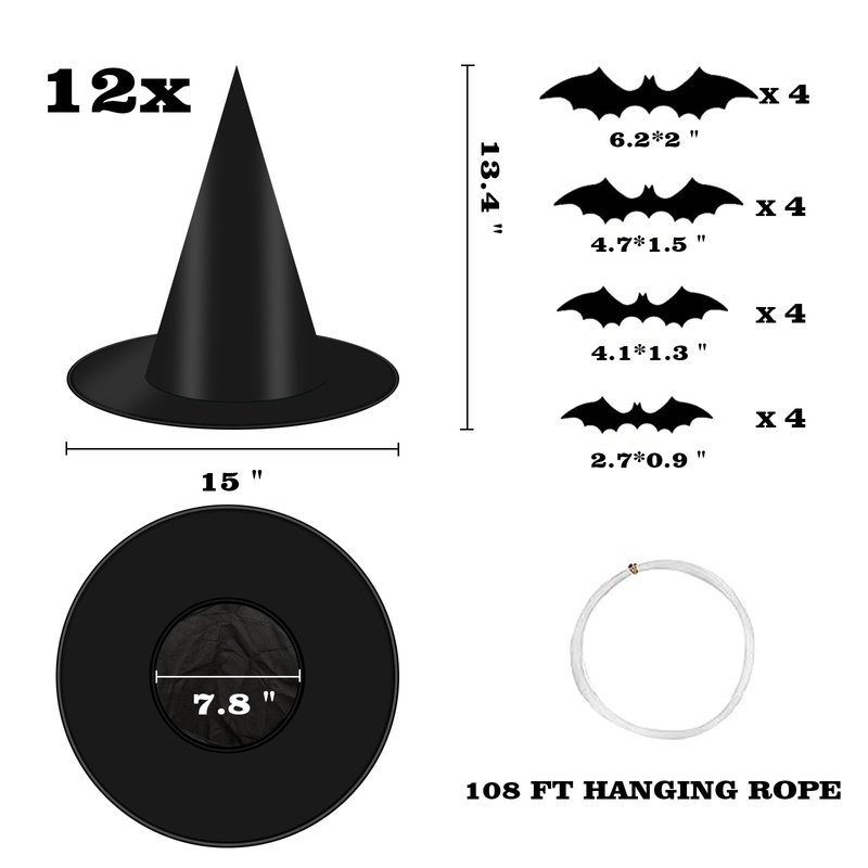 Package Includes: 12 black witch hats, 16 pcs 3D bats, a 33 m/109 ft hanging rope, and one needle.