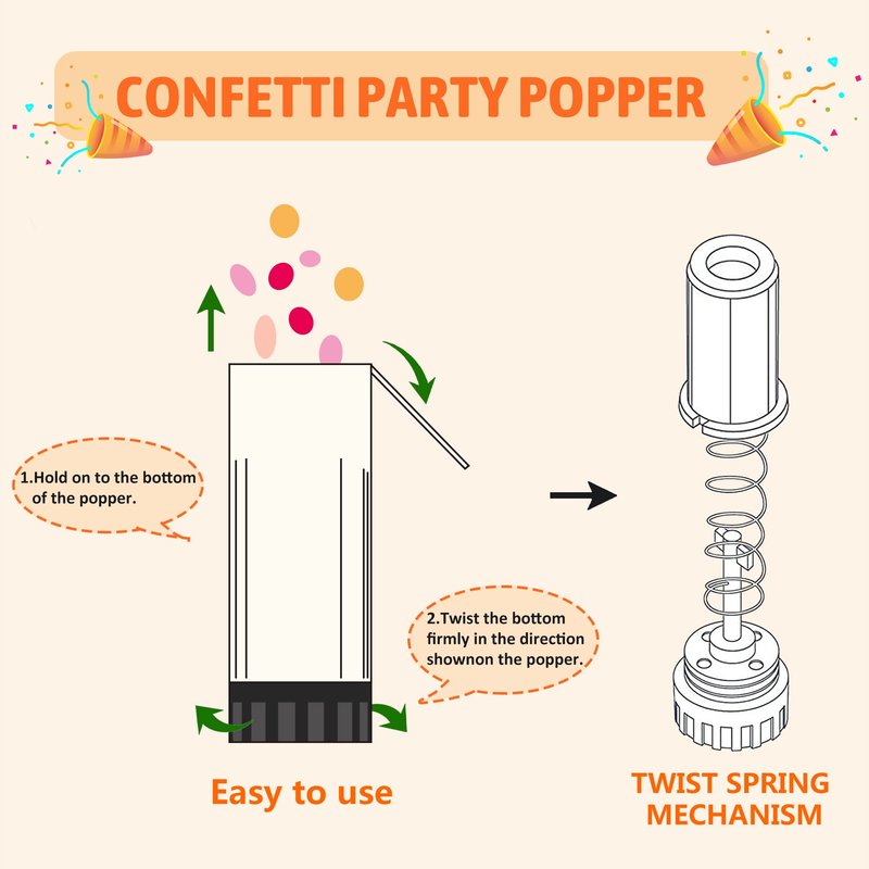- Feature: The product is driven by springs, not by traditional pressure.At the important moment, you just need to open the top cover,follow the tips to gently twist the bottom of the cannon, aiming at the sky and watch the surprise colorful paper scraps explode, bringing the party to a climax. You can record this perfect moment and save it.