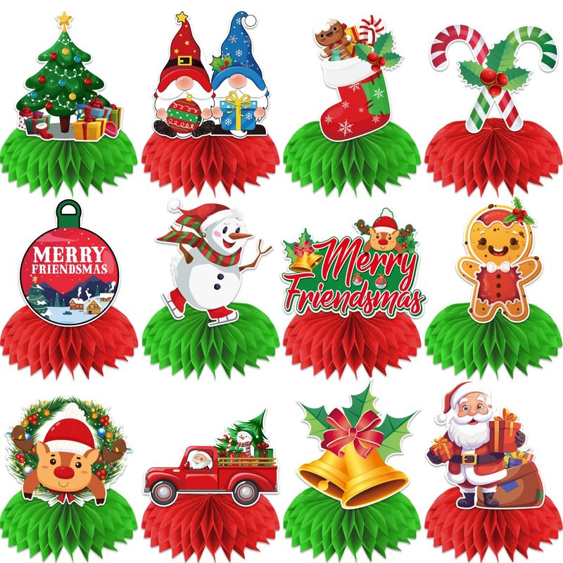 - high quality: the christmas party table decor have 12 different exquisite styles. friends christmas decorations table honeycomb centerpieces are made of heavy-duty double-sided cardstock and honeycomb orbs. adopt high-tech digital print with a photo-like shine. which will ensure that the products are non-fading, durable, sturdy, and reusable