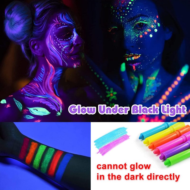 - 🌈【GLOW IN THE BLACKLIGHT PAINT】The fluorescent face paint present vivid colors under natural light, after we use these crayons for face and body painting, the makeup can glow spectacularly under black light, but they cannot glow in the dark directly.
