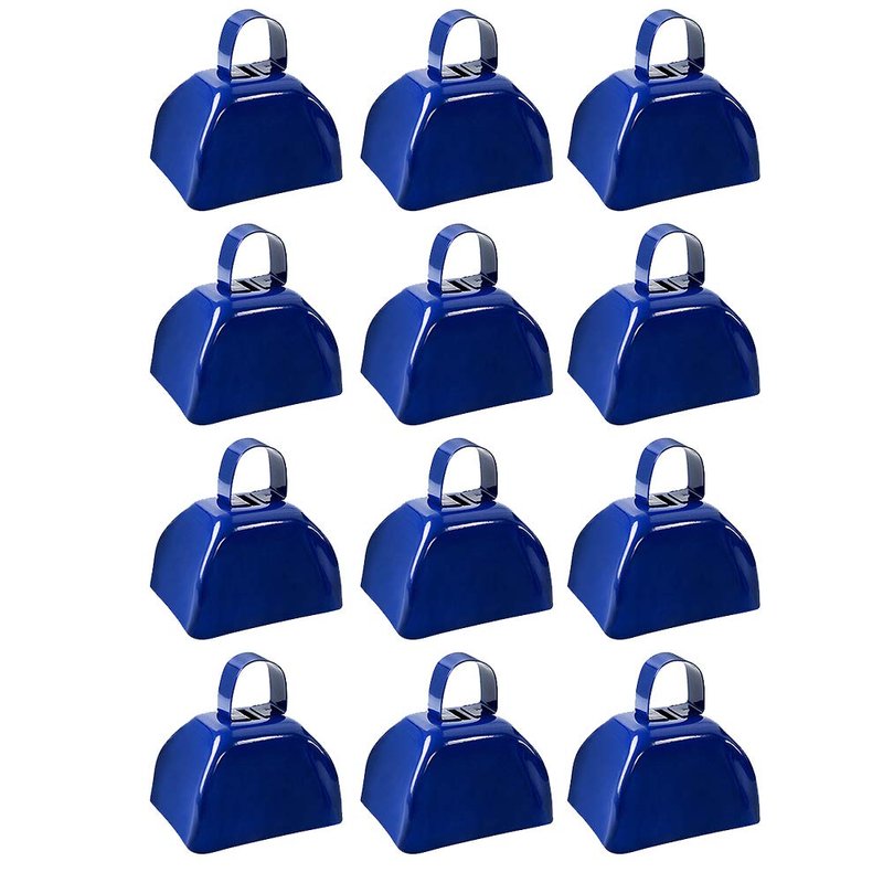 - 【3 INCH COEBELL】 This set of 12 handhelds, 3-inch cowbells are designed for cheering at sporting events, for use at public markets, weddings, classrooms, or for use in agriculture. Each cowbell comes in blue.