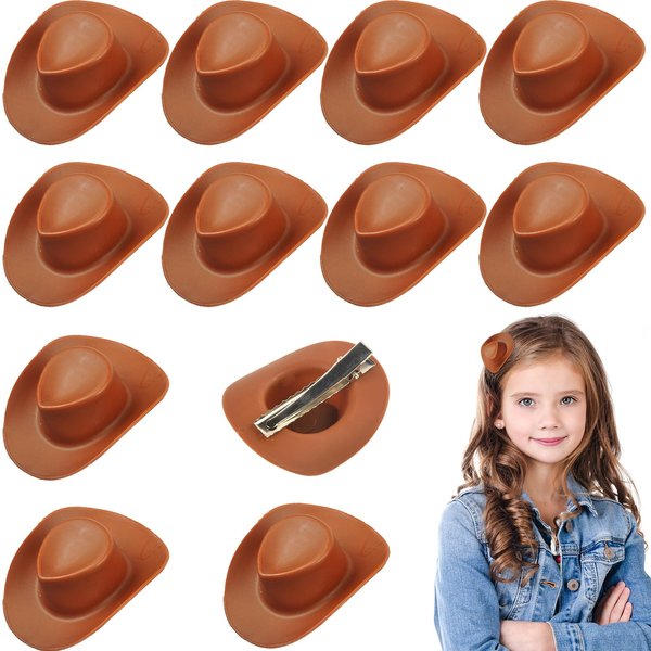 12 Pcs Mini Western Cowboy Cowgirl Hat Hair Clips, Plastic Mini Hat Hair Clip, Cute Cowboy Hat Clips, Cowgirl Hat Hair Clip for Decoration Accessories Toy Doll Dress Up Play House Games (Brown)