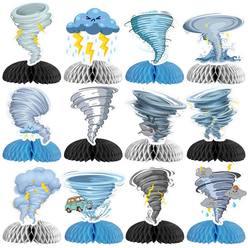 - Package Include: Our tornado party decorations include 12 pcs tornado honeycomb centerpieces in 12 different tornado styles. Brace yourself for a ton of compliments, your guests will love the unique design on the tornado table decorations