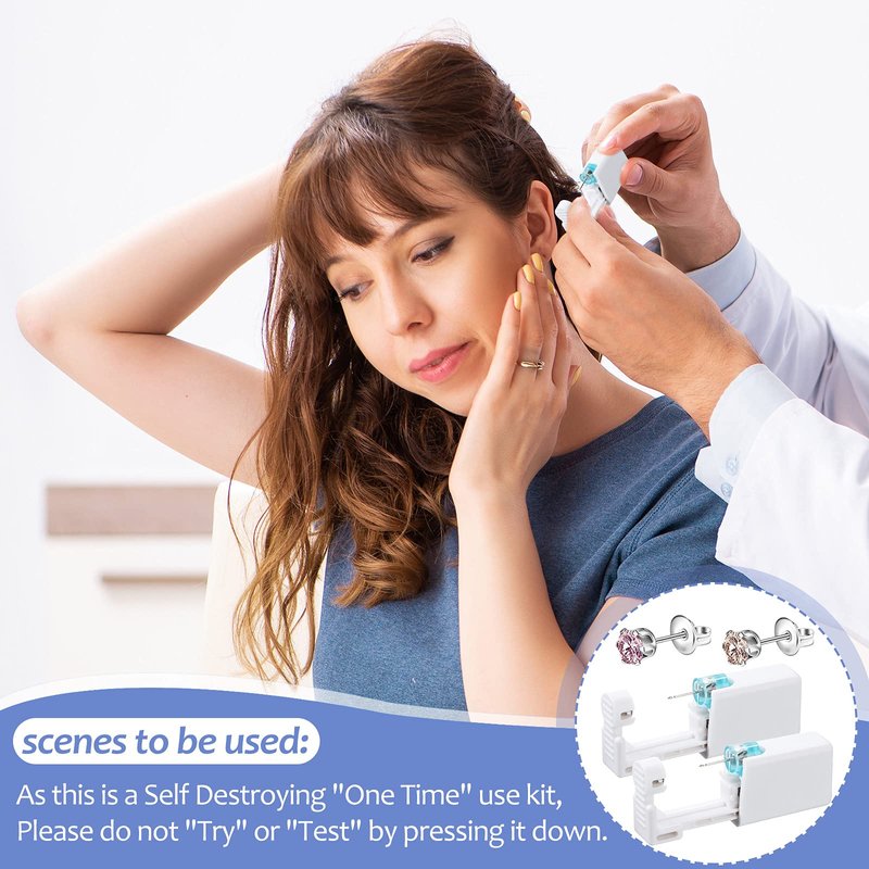 - Easy to operate: before using a piercing ear kit, wash your hand, wipe carefully the place where you want to pierce and make a maker; Aim it, press quickly the piercing gun then done; The ear plug will automatically fall off after finishing, and then it will be inserted into the ear piercing studs; Ear piercing can be done by oneself or with the assistance of others