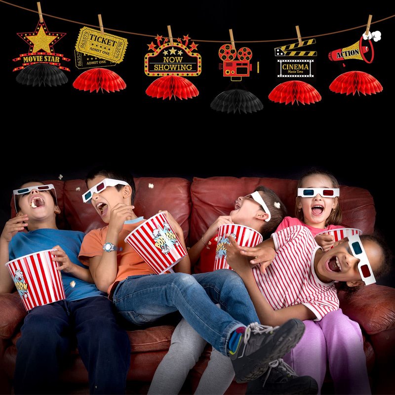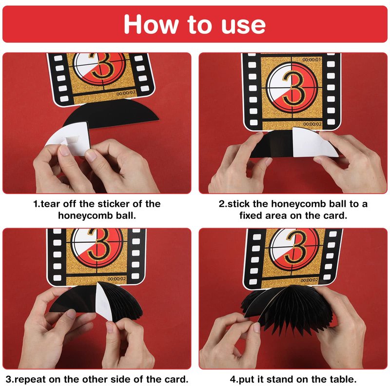 - Easy to Assemble: step1, tear off the sticker of the honeycomb ball, step 2, stick the honeycomb ball to a fixed area on the card, step 3, repeat on the other side of the card, step 4, finally put movie birthday party decorations on the table, very easy for you to assemble and save a lot of time