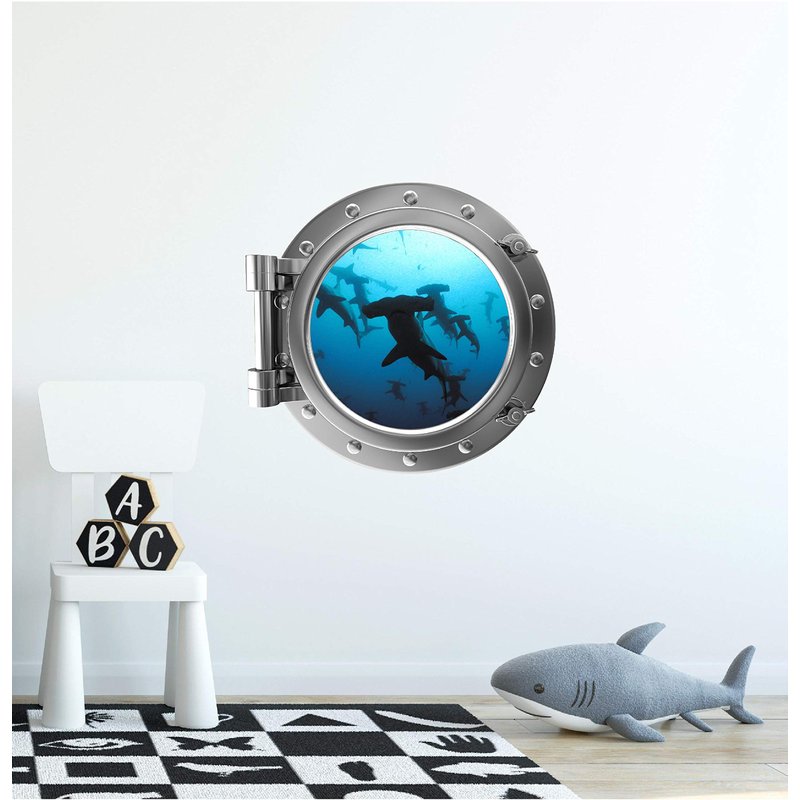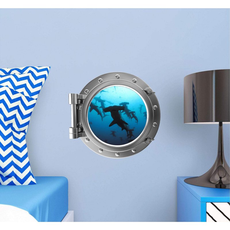 12" Porthole 3D Window Wall Sticker Shark #2 Silver Port Scape Decal Ocean Deep Blue Sea Fish Kids Room Decor Wall Art Removable Fabric Vinyl