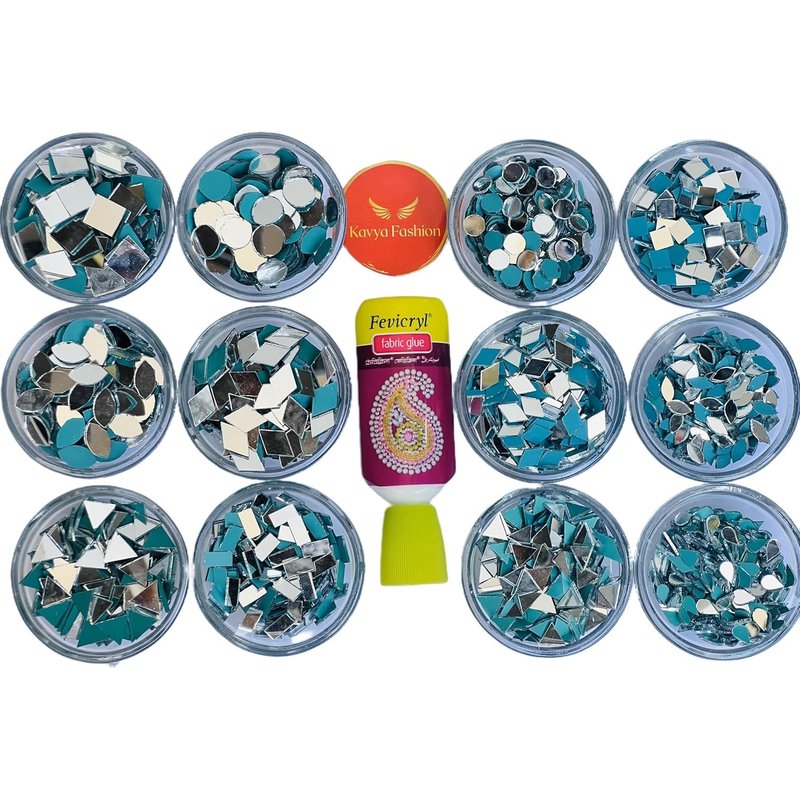 Kavya Fashion 12 Shape Mirror kit for Jewellery Making, Other Craft Work Like Project & lippen Art, mud Work Decoration (Total-1200 Pieces, 100 Pieces of Each Shape) Free Fabric Glue (Combo of 12)