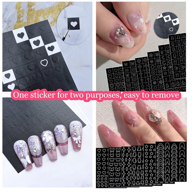 - 【Simple To Use】Pick up the airbrush stencils nail sticker and place the stencil sticker on your nail tips apply nail powder over the stencil sticker peel off the nail stencil sticker,won't hurt your nails, very easy and convenient.