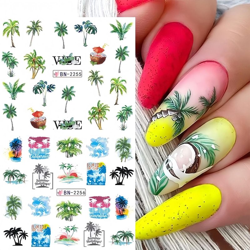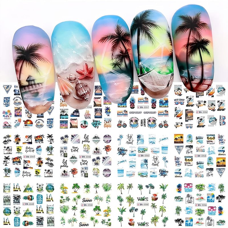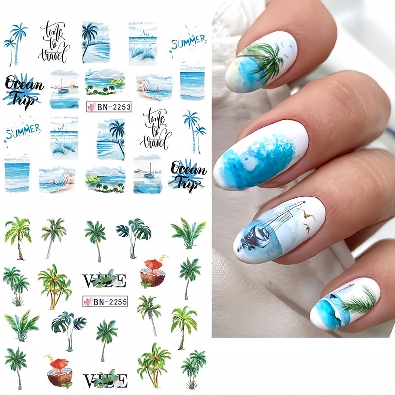 12 Sheets Beach Nail Art Stickers Summer Nail Decals Water Transfer Green Palm Nail Supplies Sunshine Beach Sea Wave Design Cool Summer Day Nail Decoration for Women Girls