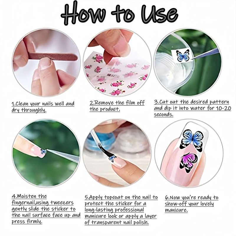 - 【EASY TO APPLY】-- Our nail decals are made using water transfer technology, making them incredibly easy to apply. Simply cut out the desired design, soak it in water, and apply it to your nails. No extra tools or professional skills required, you can effortlessly achieve personalized nail art.