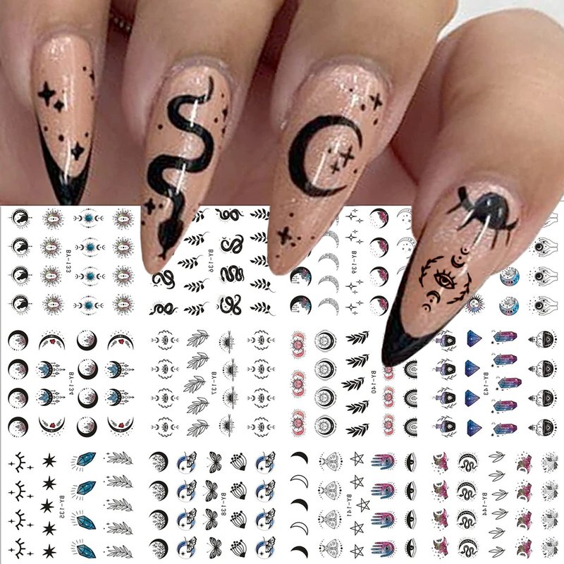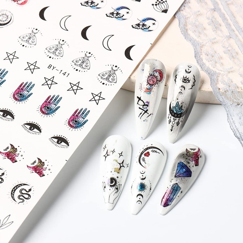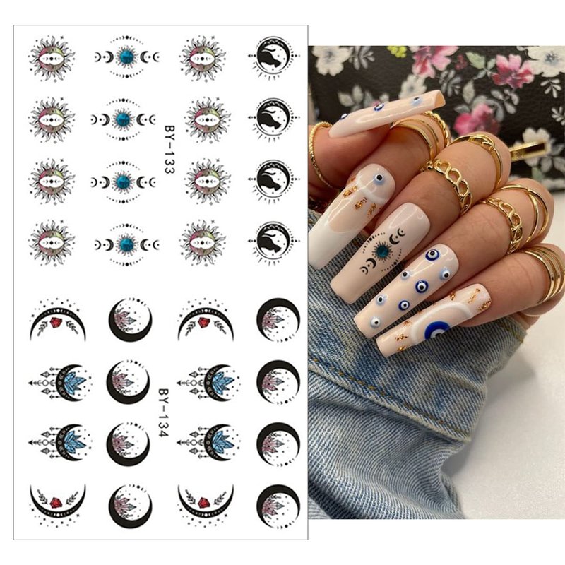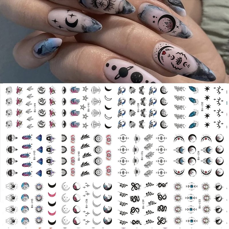 12 Sheets Moon Stars Nail Art Stickers Horrifying Eyes Nail Water Decals Transfer for Nails Sun Blue Crystal Designs Water Slider Nail Stickers Snake Nail Decoration Supplies for Women DIY Manicure