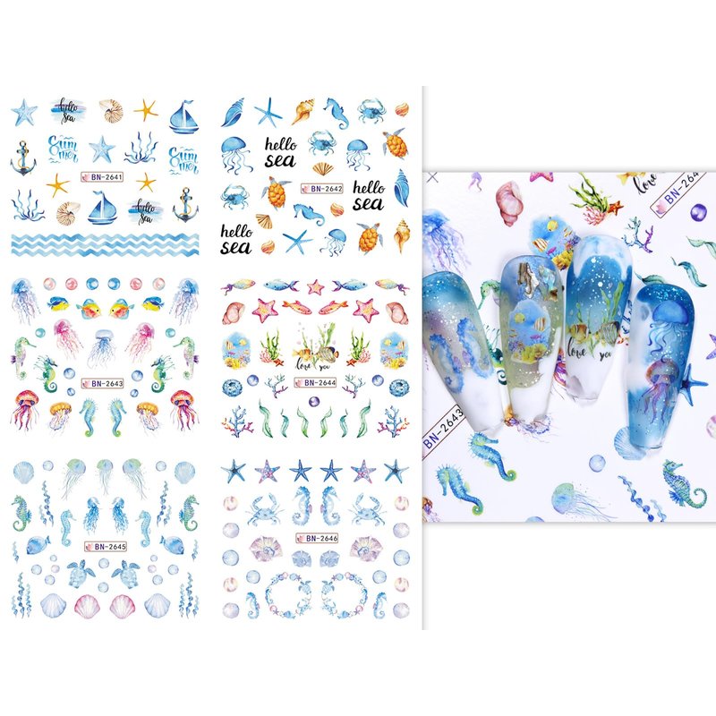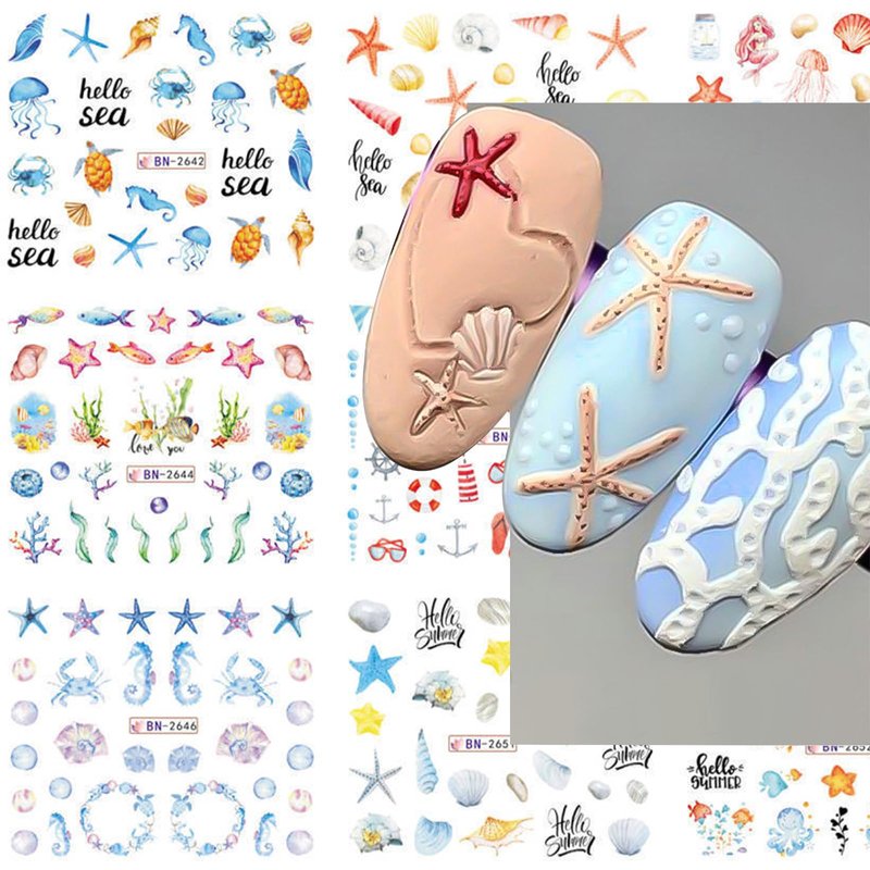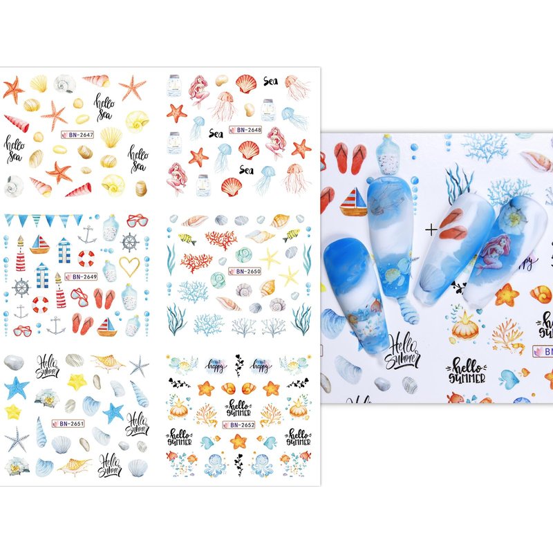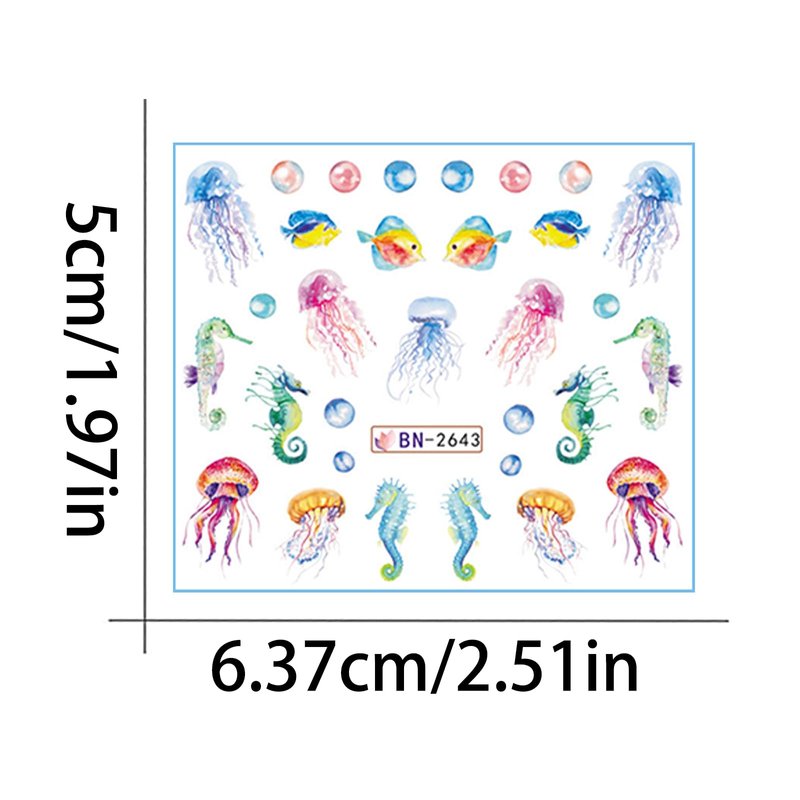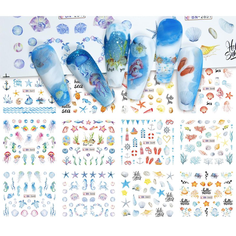 12 Sheets Ocean Water Transfer Nail Decals Cute Sea Creature Sea Shell Starfish Jellyfish Sea Turtle Summer Nail Decals Watermark Nail Designs Manicure Stickers Nail Art Accessories(15)