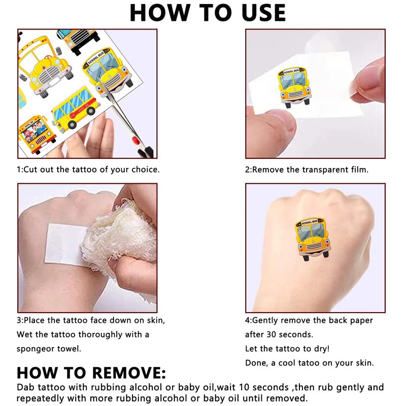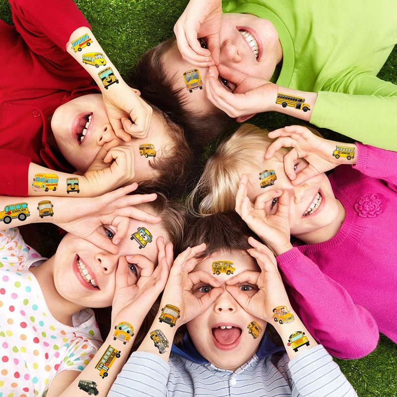 - School Bus Themed Party Decorations: The set contains instructions for use and is easy to use. Tattoos are waterproof and long-lasting. These cute school bus stickers are suitable for various parts of the body, such as arms, legs, back, face, neck, and even ankles. Whether you are preparing for a school bus theme party or just want to create your own unique style, these school bus toy stickers are your best choice.