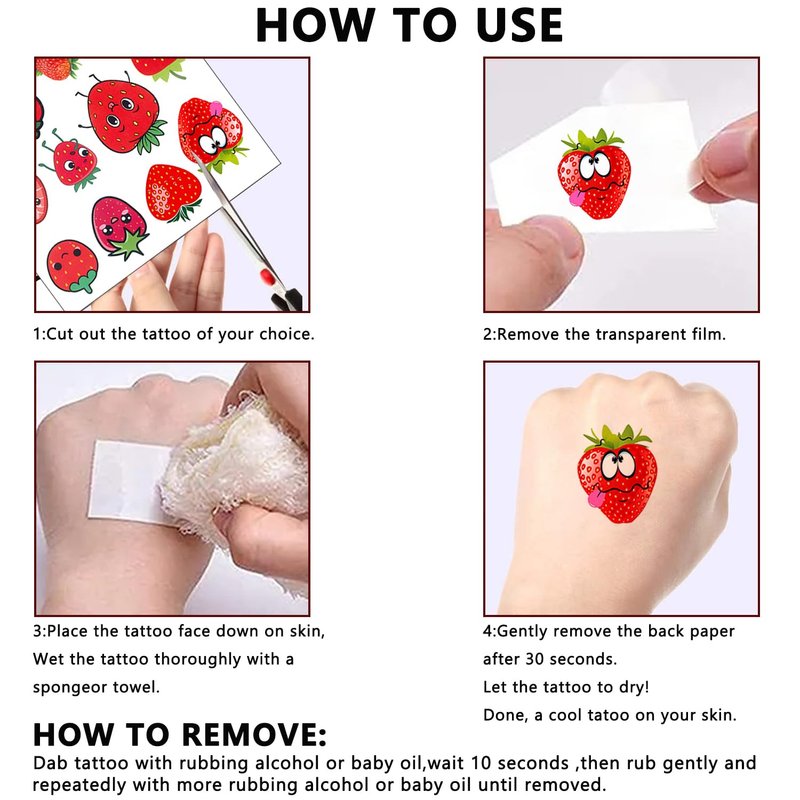 - Easy To Apply And Remove: Cut out the pattern you choose then Just place face down on skin and dampen with water. Hold it down for about 15-30 seconds and remove it. These strawberry decor tattoos stickers typically last about 3-6 days. Can be removed with oil, makeup remover, or by scrubbing off. Safe to wear at the beach or in the shower or pool.