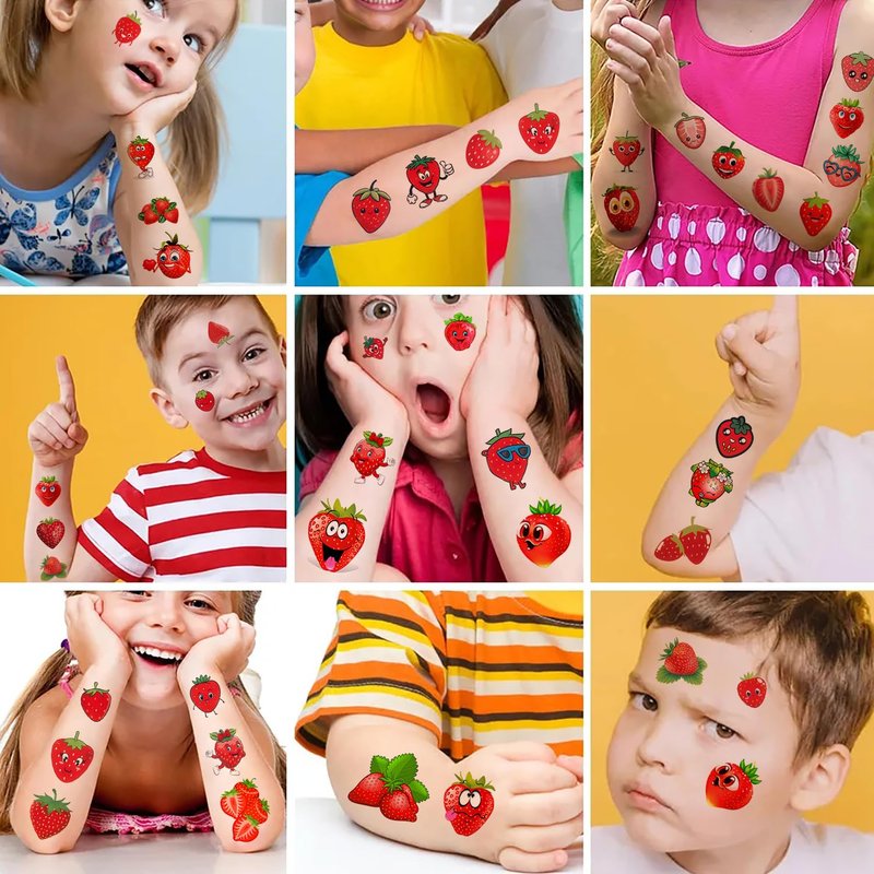- Widely Used: These strawberry birthday decorations stickers are perfect for kids party supplies, birthday party favors, carnival prizes, party decorations, goodie bag fillers, pinata, games, Christmas gifts for kids and so on. Kids could do it themselves to paste these temp tattoos on skin. Also suitable for other dry surface such as bottle, toys, birthday goodie bags and so on.