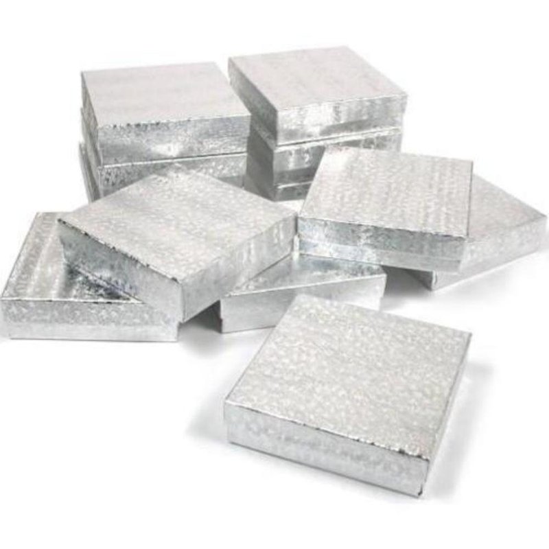 12 New Cotton Jewelry Gift Boxes For Displays, Showcases & Countertops This is a new set of 12 cotton filled jewelry boxes These silver foiled boxes are great for gift giving or store use Each measures approximately 3 1/2" x 3 1/2" x 1" (89 x 89 x 25 mm)
