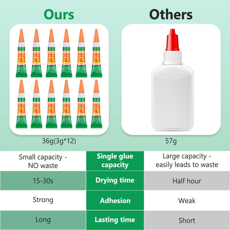 - ♻Easy to use, No Waster♻ The frustrating thing about most of super glue gel is that the container holding the stuff either gets clogged, or allows the glue to thicken to an unusable state long before the product is fully used. Lucomb instant adhesive superglue comes completely sealed, and only open when the bottom collar on the cap is twisted. And each tupe is 3 grams, drop it for one time and no need to stock for long time once open, which better that big size of glue. Moreover, there comes with 12 pack, it can be used multiple times.