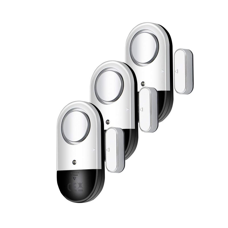 - PACKAGE INCLUDED: 3 * Alarms with tapes (Batteries included), 2 * Anti-noise Ear plugs, 1 * User manual.