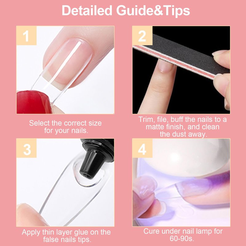 - 【Long-term Use】: You can watch online home diy clear nail tips tutorials in advance.Using the correct installation method .After installation,The full cover nail tips can keep on your fingers long for 3 weeks or more.And you can remove the glue on the nail surface and reuse our artificial nails many times!