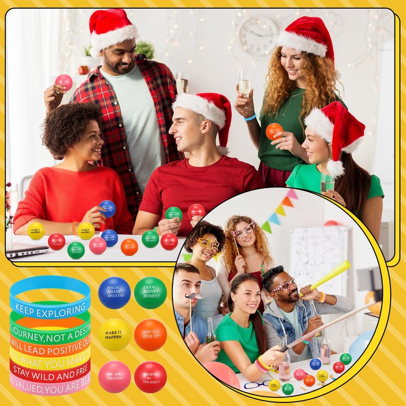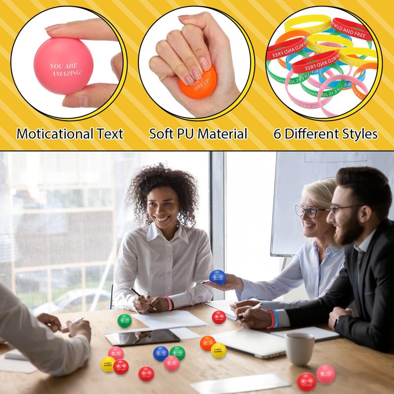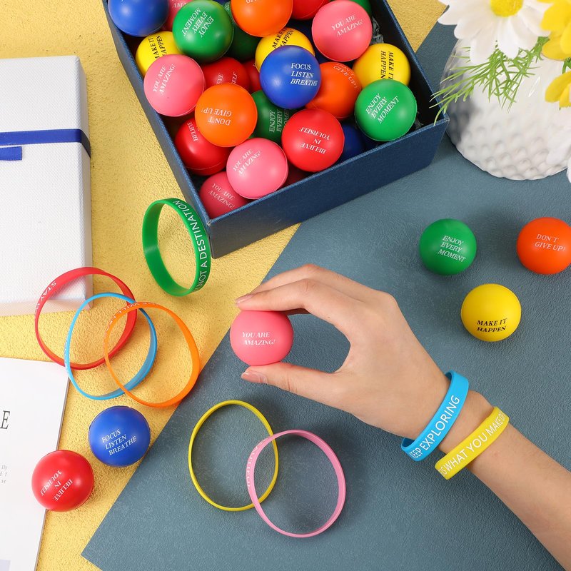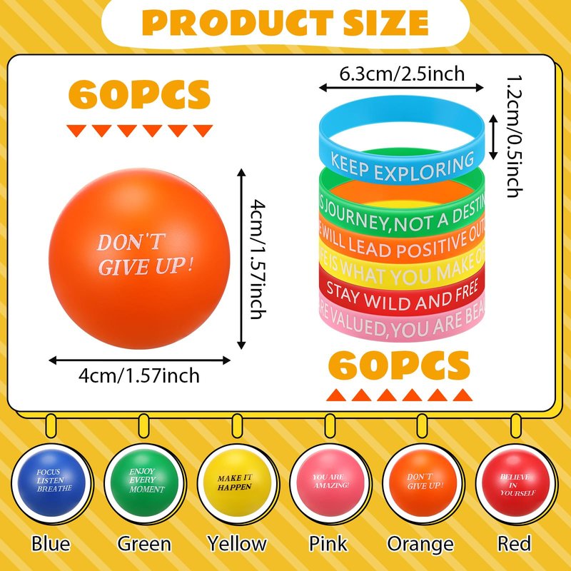 - Inspire and Motivate: fuel your motivation with our inspirational party favors; Each package includes 60 inspirational stress balls and 60 motivational bracelets, both adorned with uplifting messages; These items serve as constant reminders to stay positive and focused, helping you overcome obstacles you may face; Ideal for anyone needing a little extra boost in their daily life or during challenging times