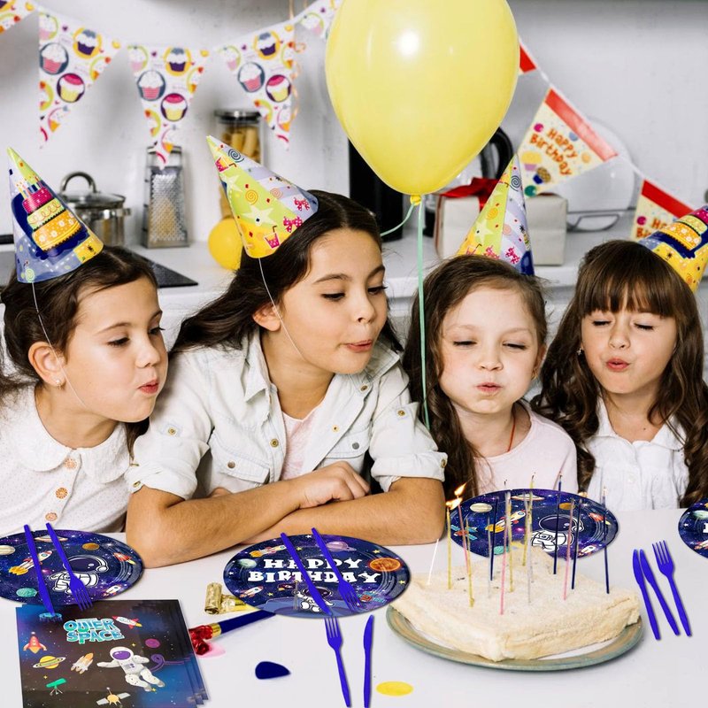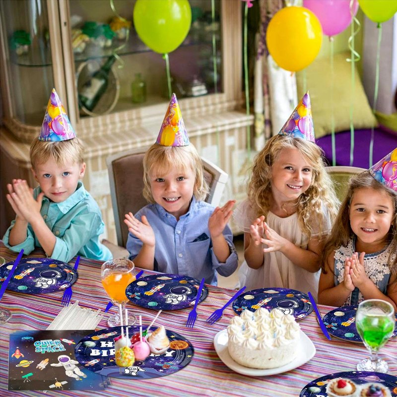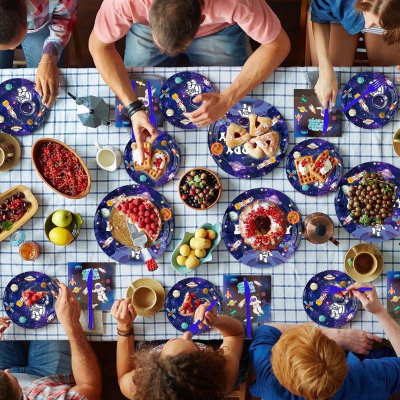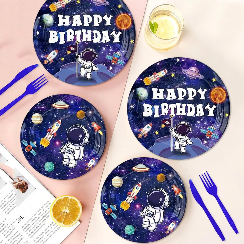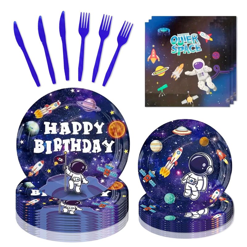 - 【Space Birthday Party Supplies】Space-themed party tableware set serves 24 Guests, consisting of 24 x 9-inch paper plates, 24 x 7-inch paper plates, 24 napkins, 24 plastic forks, and 24 plastic knives.