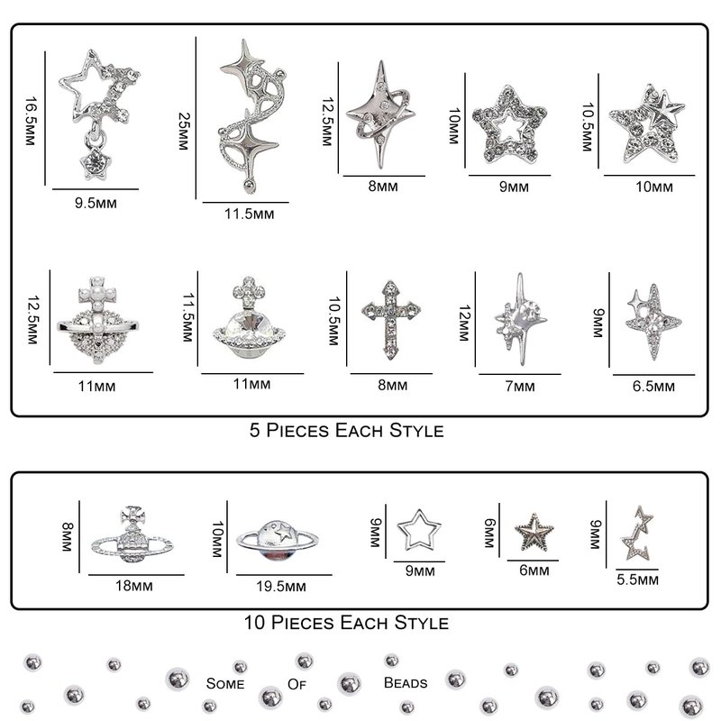 - Y2K Style: You will get 100pcs star series nail charms and dozens of beads in silver color, 15 different styles, metal base with inlaid rhinestones, very shiny and unique. Elevate your nail game with these dazzling nail gems and charms that exude Y2K vibes and a touch of nostalgia.
