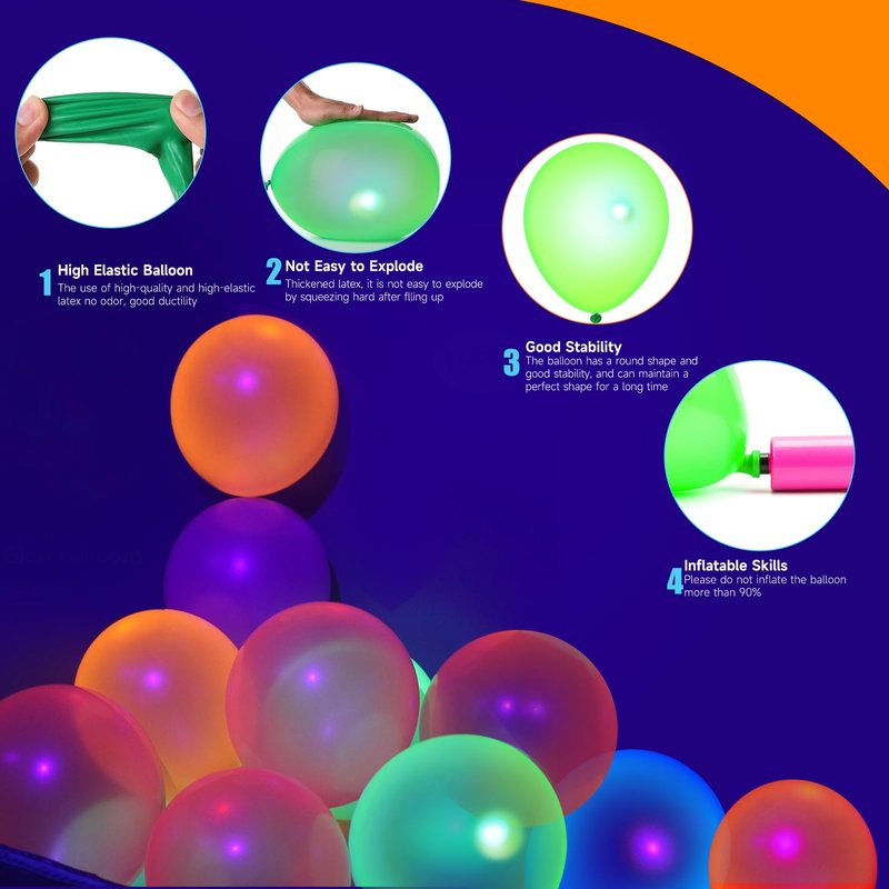 - 【Warm Tips】 Neon color balloons will not glow in the dark without UV-Black light response. Please do not inflate the balloon more than 90% to avoid sudden popping, and pay attention to avoid high temperature and sharp objects. If you have any questions, please feel free to let us know. We are glad to serve you and you will get a satisfactory solution within 24 hours