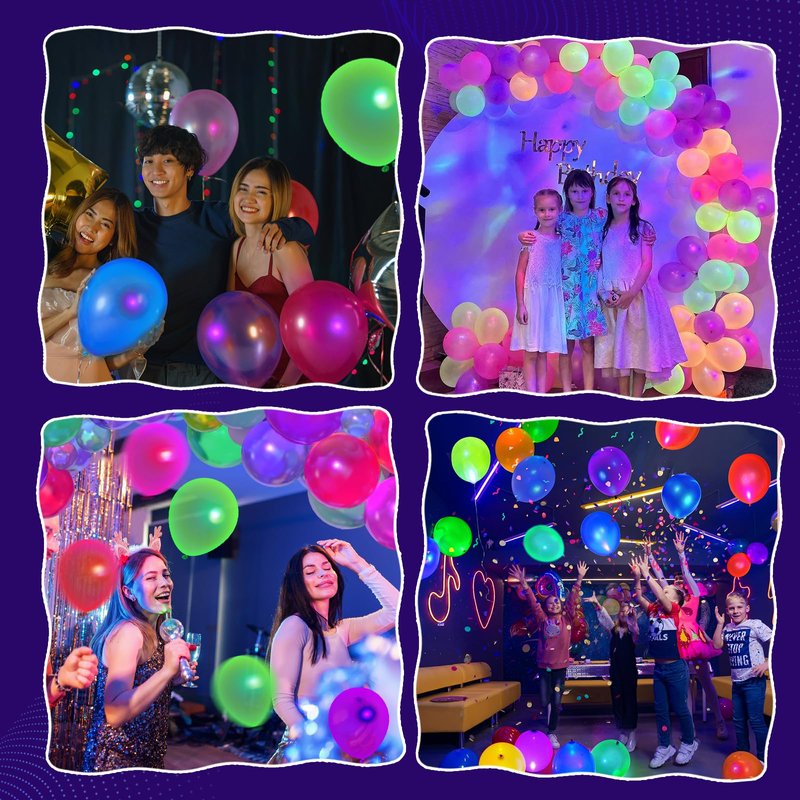 Brightly colored neon party balloons that are bright in daylight but glow in black light, perfect for an essential part of any black light themed event such as black light parties, carnivals, baby showers, bridal showers, weddings, birthday parties, and more.