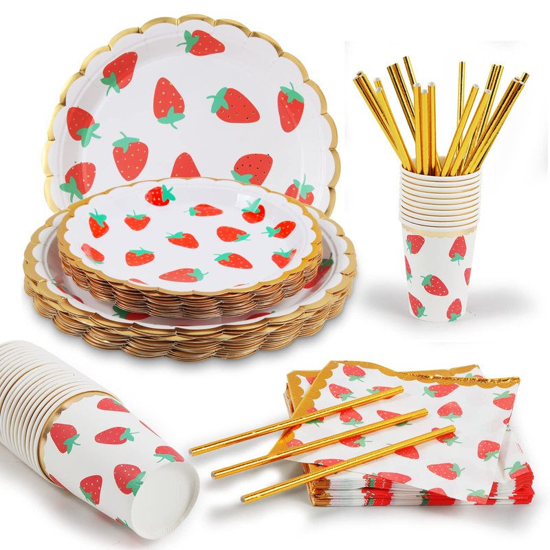 - 【Strawberry Disposable Tableware Set】: Total 120 piece, includes 20 * 9” dinner plates, 20 * 7” dessert plates, 20* 9.5 oz paper cups, 20 * Straws and 40 * Napkins enough for 20 guests.